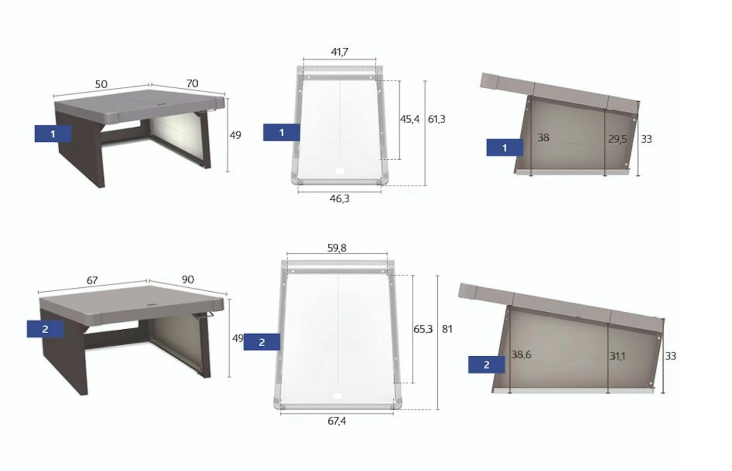 | Innenmaße (B x T x H) | B 42 x T 45,5/60 cm (Gr. 1) B 60 x T 65,5/80 cm (Gr. 2) |