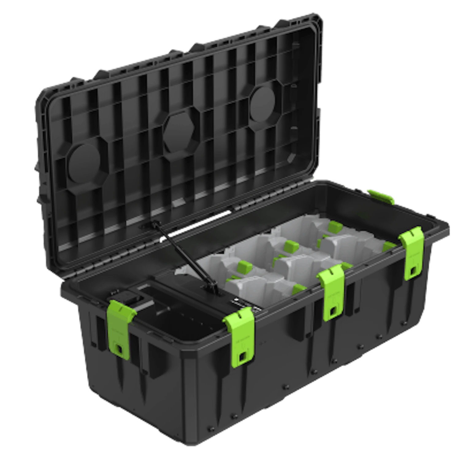 Laden Sie sechs EGO-Akkus gleichzeitig mit Ihrem Multi-Port-Ladekoffer. Mit einem Scharnierdeckel und zusätzlichem Stauraum eignet sich der fahrbare Ladekoffer perfekt für den Transport zur Baustelle, wenn Sie ein professioneller Nutzer sind, und für eine sichere und saubere Aufbewahrung unabhängig von seiner Verwendung.