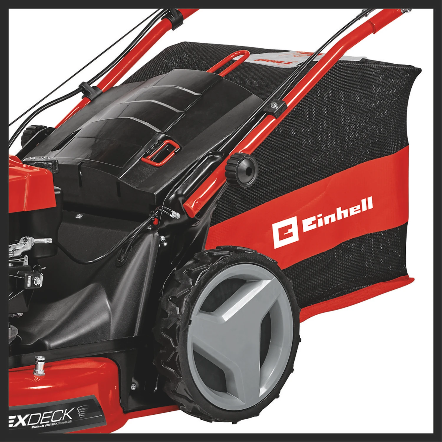 Der Einhell Benzin-Rasenmäher GE-PM 53/2 S HW-E Li bietet alle Features eines kraftvollen Helfers, um Rasenflächen bis 1.800 m² zu pflegen. Der 1 Zylinder Einhell 4-Takt OHV Motor hat einen abschaltbaren Hinterradantrieb. Bequemes Arbeiten ermöglichen der höhenverstellbare und klappbare Führungsholm mit Softgrip, das Holmkonzept mit Reinigungs- und Lagerposition. Um das Mulchen wird die Funktionalität des Mähers erweitert durch den Mulchadapter. Der Estarter ist mit einem Akku der Power X-Change-Systemreihe ausgerüstet und wird auf Knopfdruck gestartet. Bequem gereinigt wird der Mäher dank Vortex Technology Deck mit Gartenschlauch-Waschanschluss und mitgeliefertem Reinigungsschaber.