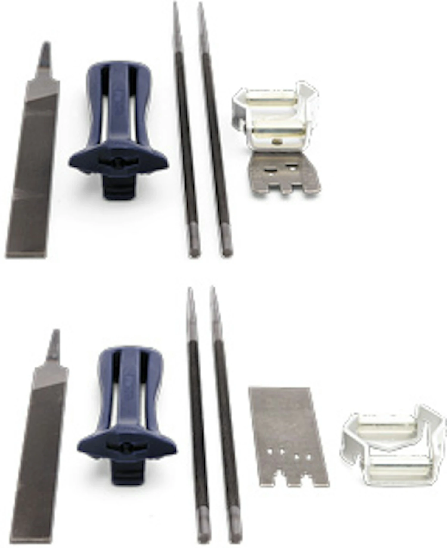 Komplettes Kit, bestehend aus Feilengriff, Kombilehre oder einer Feillehre und einer Tiefenbegrenzerlehre, zwei Rundfeilen und einer Flachfeile.