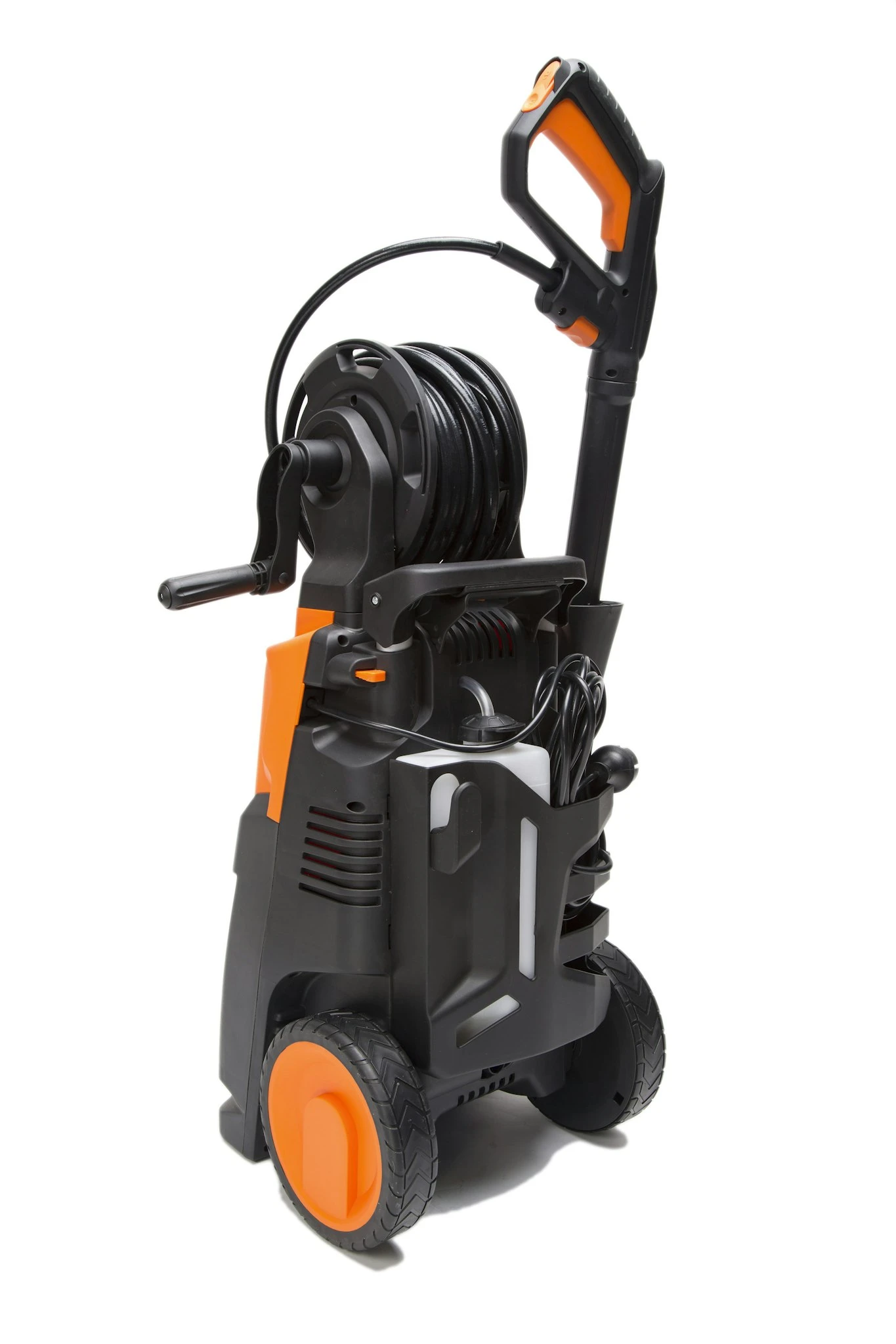 Die intergrierte Aluminiumpumpe darf mit einer max. Eingangswassertemperatur von 40 Grad betrieben werden. Der Hochdruckreiniger verfügt des Weiteren über einen separaten Seifentank sowie eine Schlauchtrommel zur einfachen Ab- und Aufrollung des Hochdruckschlauchs.